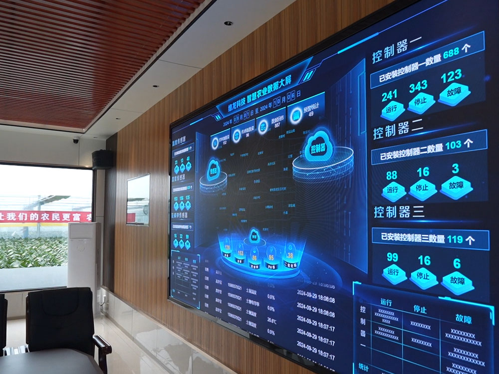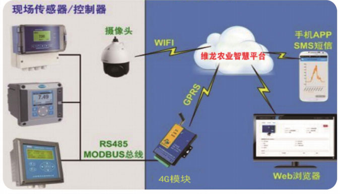 为客户建立维龙农业智慧大脑,将所有传感器回传的数据进行分组分析建模,输出各类预警信息和控制信号,预警信息通过短信或自动语音电话通知用户,并在微信小程序或监控大屏显示;控制信号通过4G无线连接前端控制板,控制各类硬件设备,并实时回传当前设备状态.
